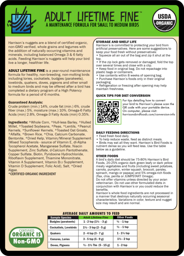 ADULT LIFETIME FINE is a year-round maintenance formula for healthy, non-breeding, non-molting birds including lories, cockatiels, budgies (parakeets), lovebirds, quakers, doves, pigeons and other small to medium birds and may be offered after a bird has completed a dietary program of a High Potency formula for a period of 6 months.