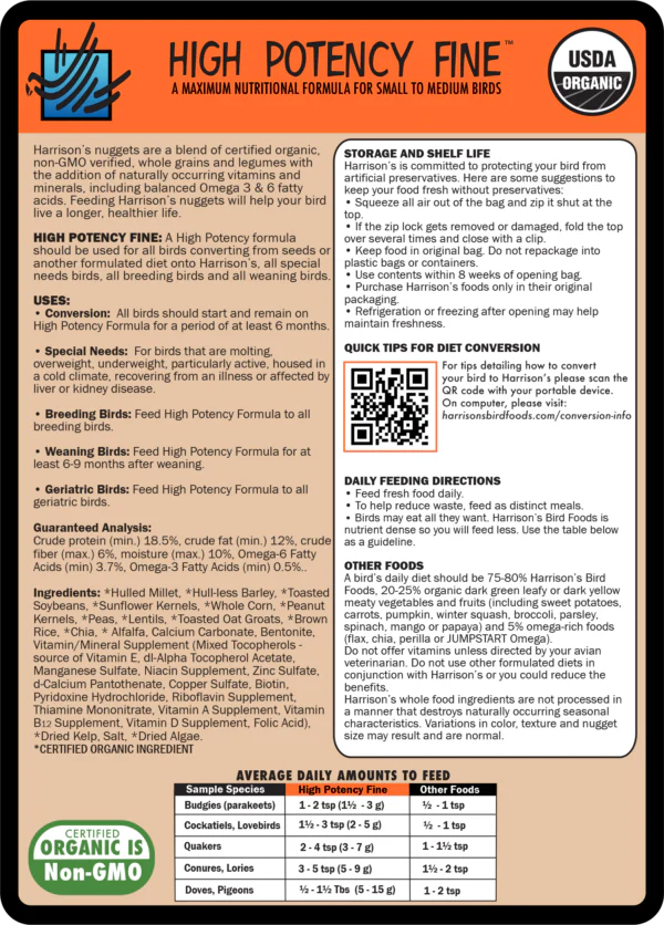 Harrison’s nuggets are a blend of certified organic, non-GMO verified, whole grains and legumes with the addition of naturally occurring vitamins and minerals, including balanced Omega 3 & 6 fatty acids. Feeding Harrison’s nuggets will help your bird live a longer, healthier and happier life. HIGH POTENCY FINE is a year-round formula for conures, lories, quakers, cockatiels, budgies (parakeets), lovebirds, doves and other small to medium birds.