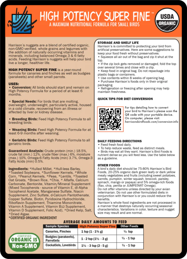 Harrison’s nuggets are a blend of certified organic, non-GMO verified, whole grains and legumes with the addition of naturally occurring vitamins and minerals, including balanced Omega 3 & 6 fatty acids. Feeding Harrison’s nuggets will help your bird live a longer, healthier and happier life. HIGH POTENCY SUPER FINE is a year-round formula for canaries and finches as well as budgies (parakeets) and other small parrots.