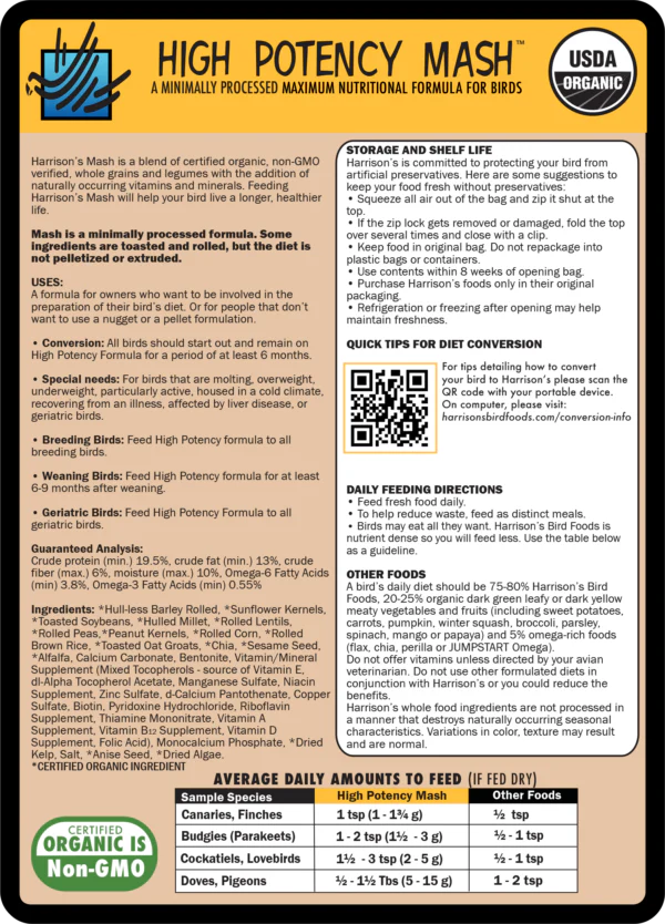 Harrison’s Mash is a blend of certified organic, non-GMO verified, whole grains and legumes with the addition of naturally occurring vitamins and minerals. Feeding Harrison’s Mash will help your bird live a longer, healthier and happier life. HIGH POTENCY MASH is a year round formula for canaries, doves, budgies (parakeets), cockatiels, lovebirds, finches, pigeons and other small birds.