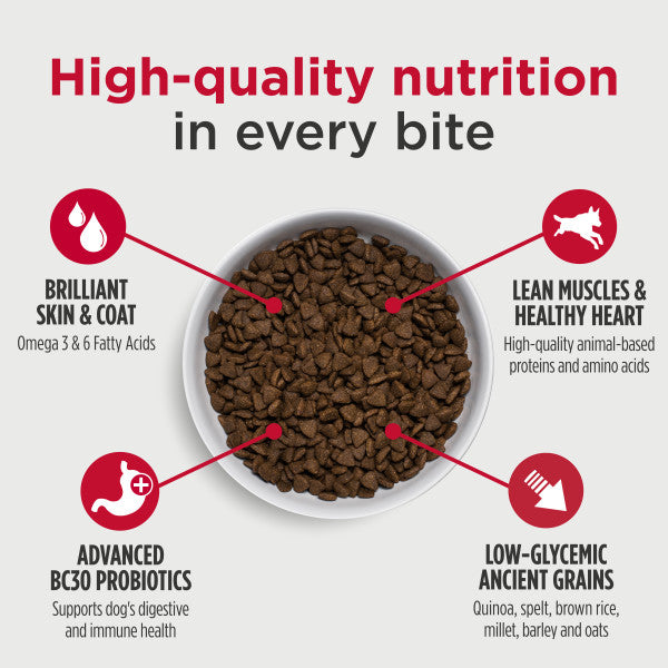 - Heart, Brain & Skin Support with Omega Fatty Acids – Enriched with taurine and omega-3 & -6 fatty acids, this ancient grain dog food helps support heart health, brain function, and a shiny coat—keeping medium and maxi breed adult dogs healthy from the inside out.