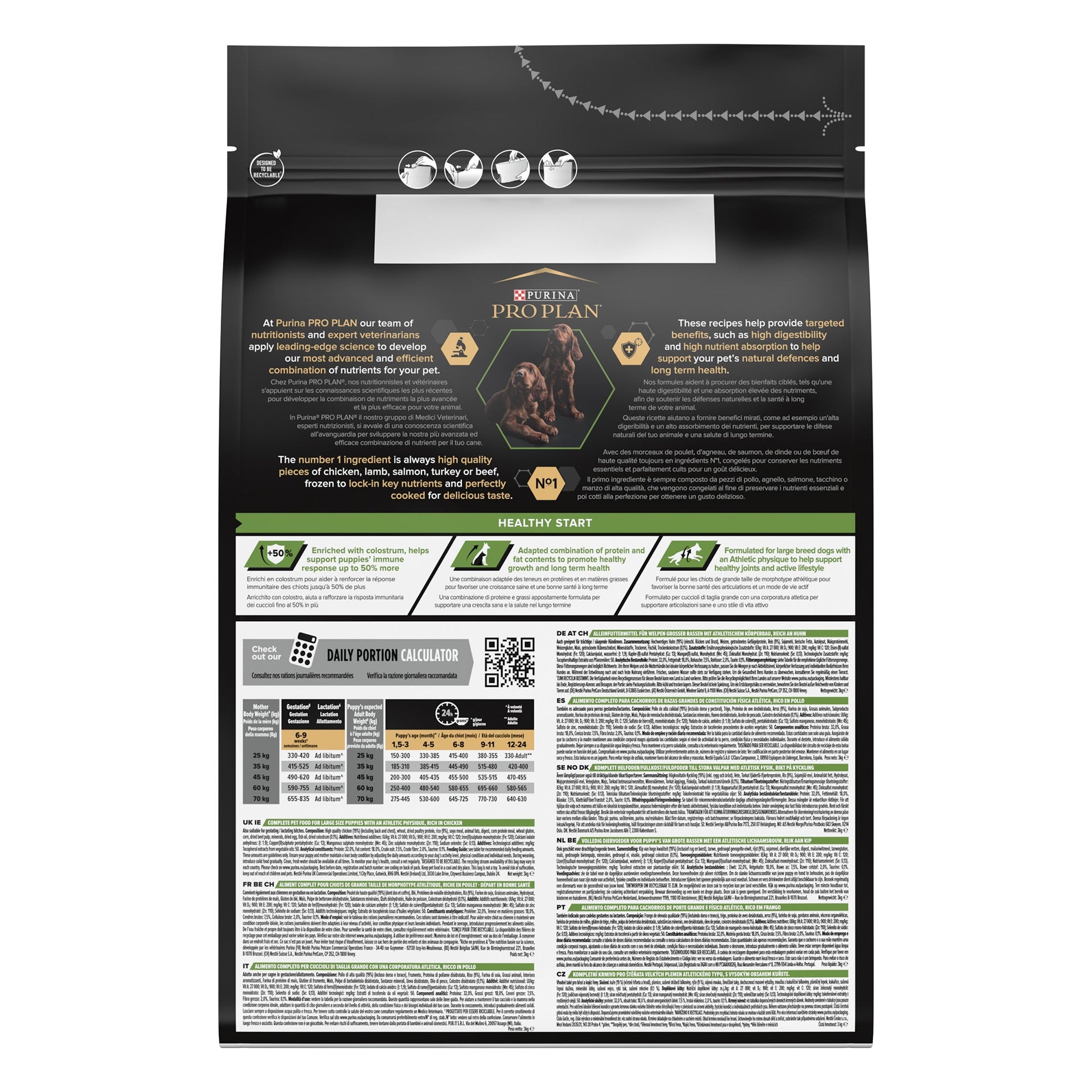 Purina Pro Plan Large Athletic Puppy, Dry Dog food with Chicken is suitable for large athletic breed puppies (more than 25 kg adult weight). This dry puppy food contains vitamin D, minerals and specific levels of omega-3 (0.3%) to help support healthy teeth and gums. It is rich in high quality chicken and provides optimal nutrition for your large puppy's growth up to 24 months of age, when they will grow into adult dogs.