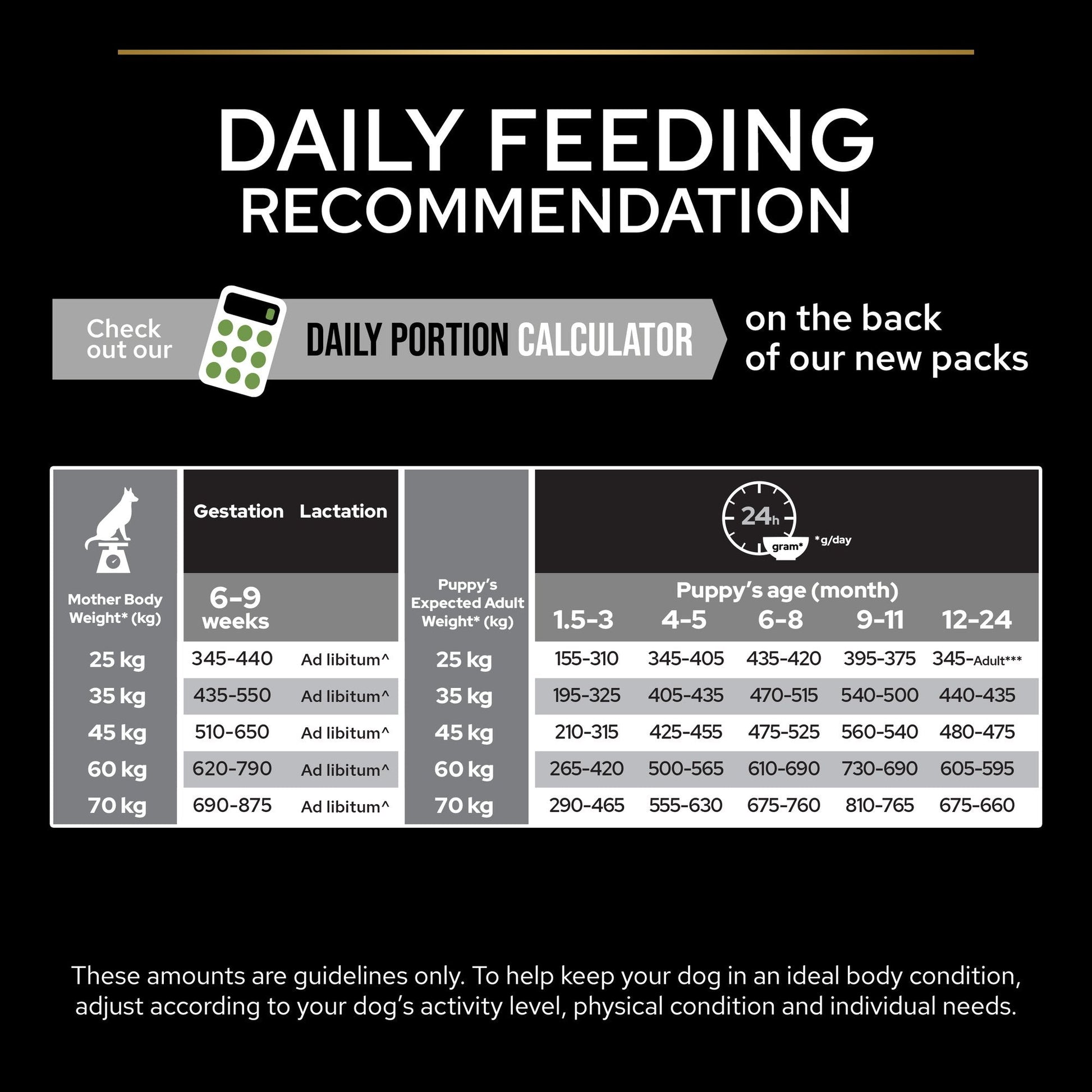Weaning and growth: During weaning from 3 to 6 weeks of age offer moistened PRO PLAN Puppy 3 to 4 times per day. After weaning, feed according to the guidelines in the table. From 3 months gradually reduce the amount of added water. For healthy development, ensure your puppy maintains a lean body condition during growth. Adjust the daily amounts up or down according to your puppy’s activity level, physical condition and individual needs. Clean, fresh water should be available at all times. To monitor your dog’s health, consult a vet regularly.
