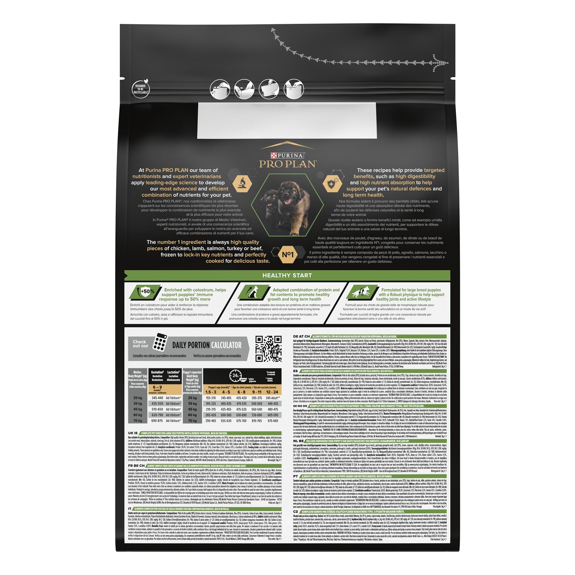 Purina PRO PLAN Healthy Start LARGE PUPPY ATHLETIC is suitable for large athletic breed puppies (more than 25 kg adult weight). This dry puppy food contains vitamin D, minerals and specific levels of omega-3 (0.3%) to help support healthy teeth and gums. It is rich in high-quality chicken and provides optimal nutrition for your large puppy's growth up to 24 months of age, when they will grow into adult dogs.