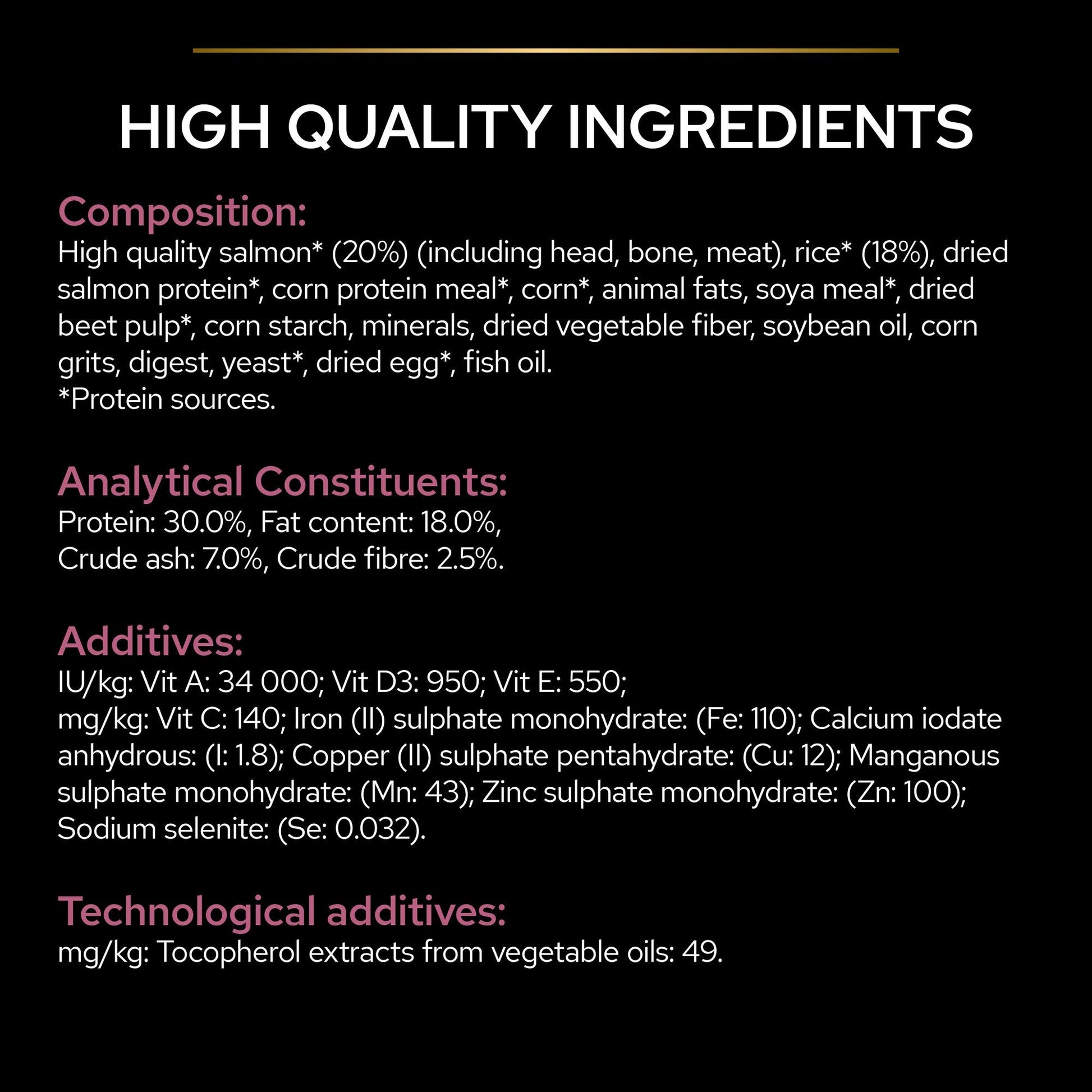 Purina Pro Plan Sensitive Skin Small and Mini Adult, Dry Dog food with Salmon is made with highquality salmon pieces as the first ingredient. This dry dog food is carefully formulated with selected protein sources and no wheat, making it especially suitable for sensitive dogs. Boosted levels of long chain omega3 fatty acids (0.8%) help manage sensitive skin. The High protein content helps maintain strong muscles and an ideal body condition. This formula is made to help dogs thrive.