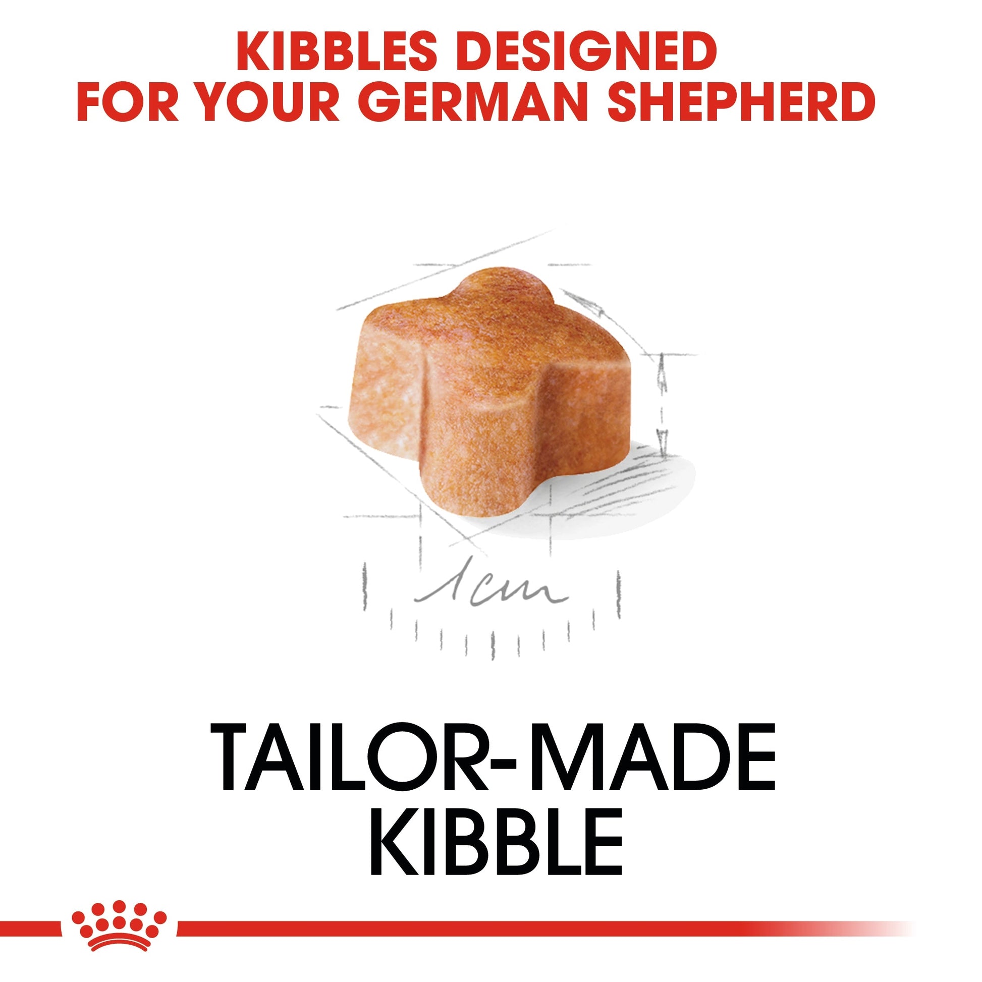 Suitable for German Shepherd Puppies up to 15 months old, ROYAL CANIN® German Shepherd Puppy is specially formulated with all the nutritional needs of your young German Shepherd in mind. Growth is an essential stage in your dog’s life: it is the time of big changes, discoveries and new encounters. During this key period, your puppy’s immune system develops gradually. ROYAL CANIN® German Shepherd Puppy helps support your puppy’s natural defences, thanks particularly to a patented complex of antioxidants including vitamin E. ROYAL CANIN® German Shepherd Puppy contains an adapted combination of nutrients that help to support optimal digestive health. This includes protein specifically selected for its very high digestibility. The shape and size of the kibble in ROYAL CANIN® German Shepherd Puppy is specifically designed to be highly palatable whilst also being specially adapted for the German Shepherd puppy’s jaw. Thanks to an adapted calcium and phosphorus content, ROYAL CANIN® German Shepherd Puppy contributes to supporting healthy and strong bones and joints. Furthermore, this exclusive formula also helps to maintain an ideal weight.