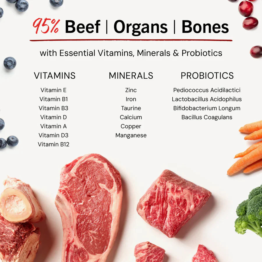 - 90-95% Meat, organ and bones - A true prey model diet